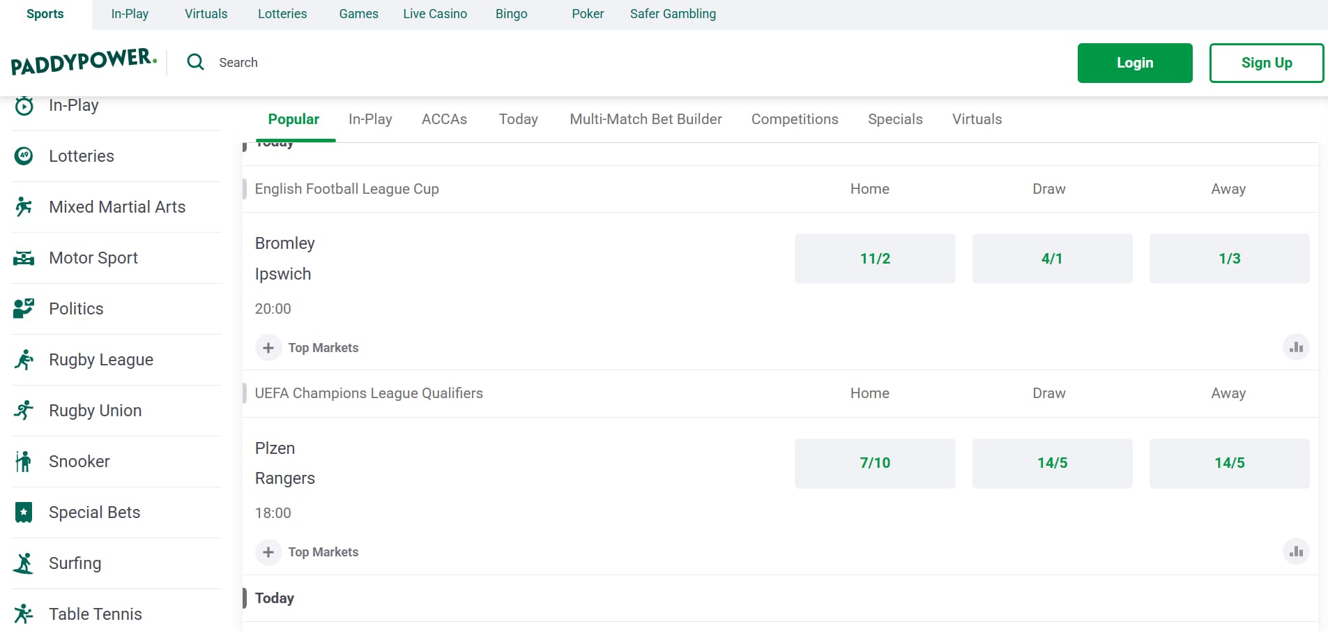 Paddy Power offers one of the broadest sportsbooks available to UK punters with strong football and horse racing markets plus over 30 other sports including tennis, golf and darts. The platform has excellent market depth across major leagues and events, and features like Bet Builder, Cash Out and enhanced accumulator bonuses make it easy to personalise your bets and maximise returns.